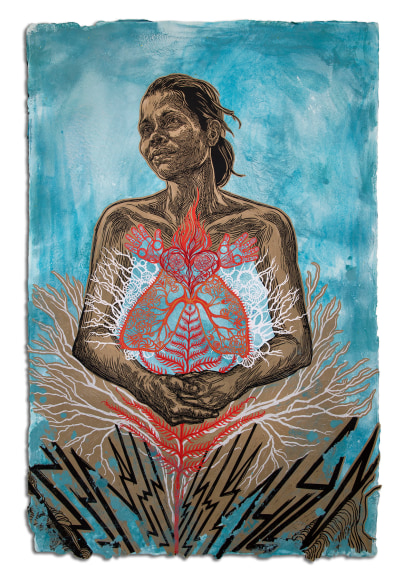 Linoleum block print, paper cutout, hand made paper, hand painted acrylic paint, color wash