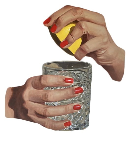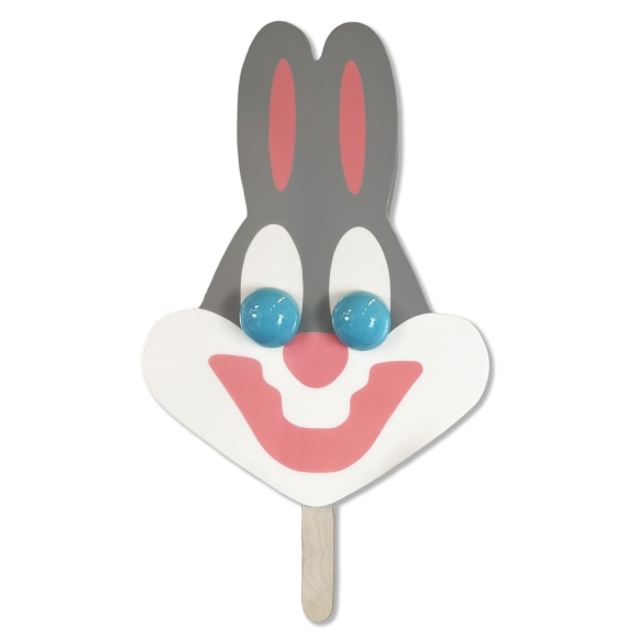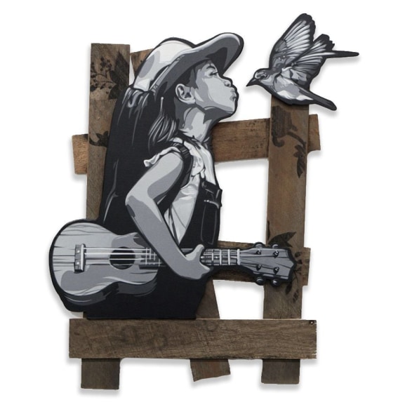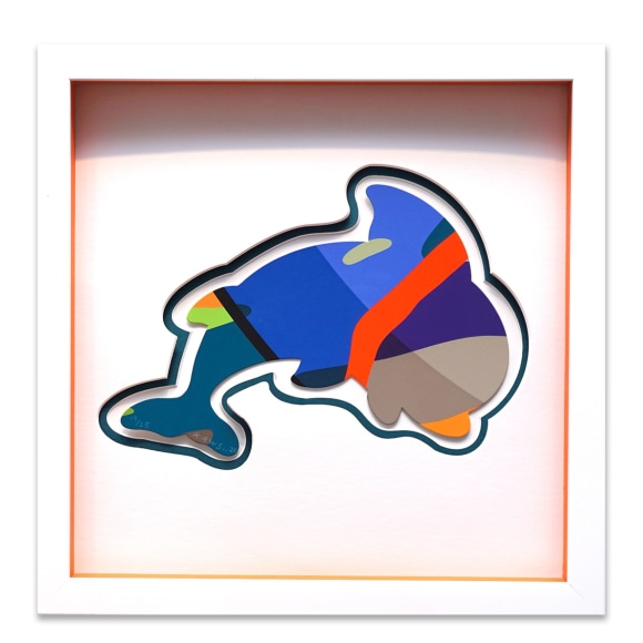Acrylic on shaped canvas and hand-carved wood with high gloss varnish