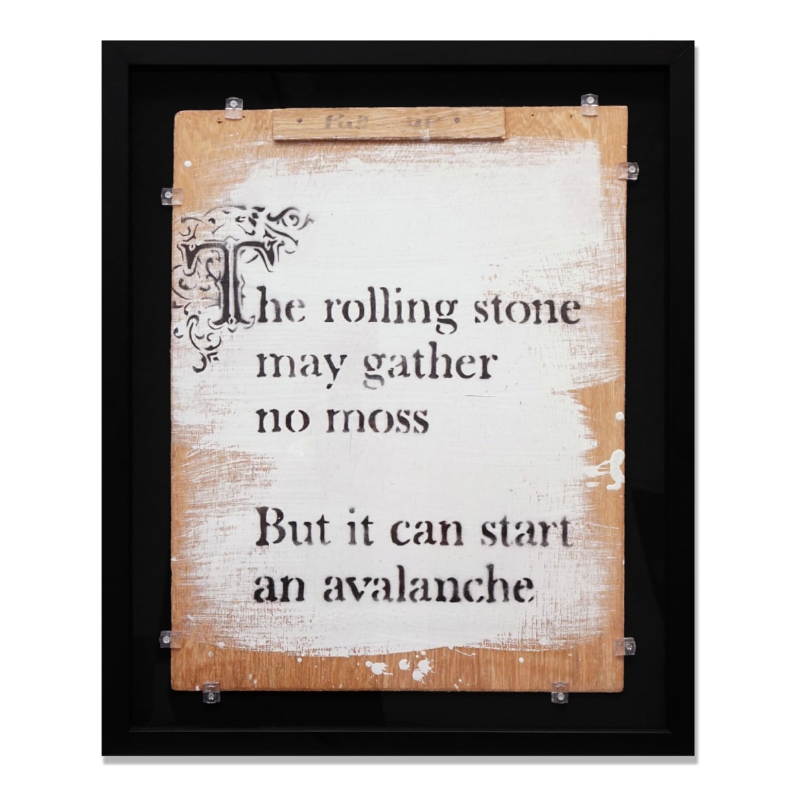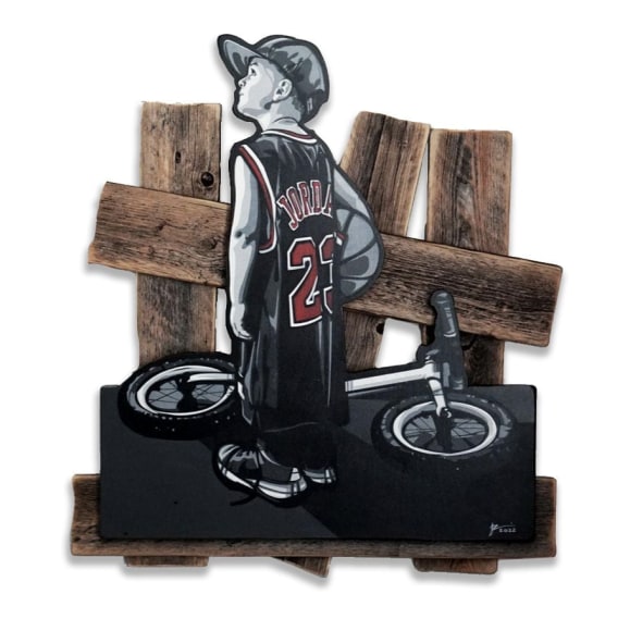 Spray paint, hand scrolled wooden cutout, wood panel and reclaimed wood assemblage, Shellac and satin polycrylic finish