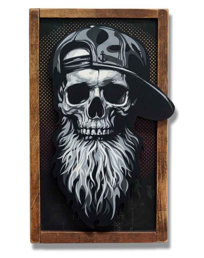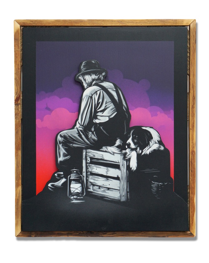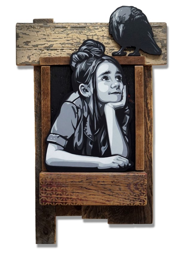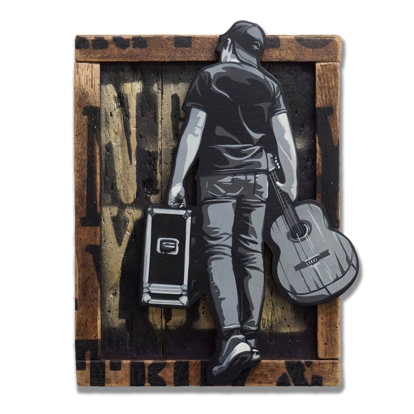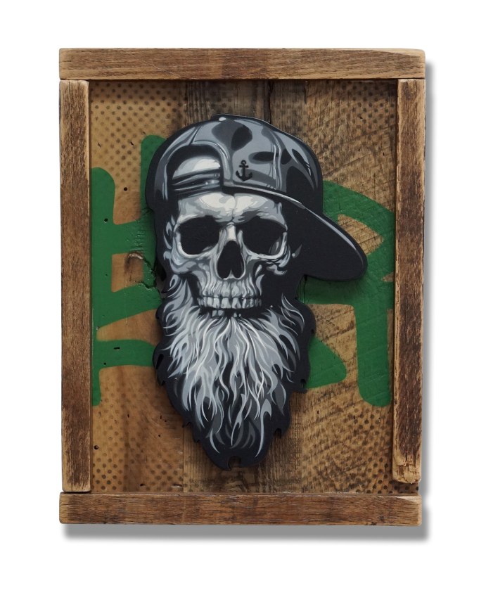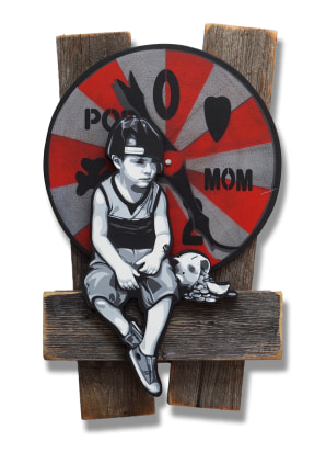 Hand scrolled wooden cutout, spray paint, acrylic, stain, reclaimed wood assemblage, satin varnish
