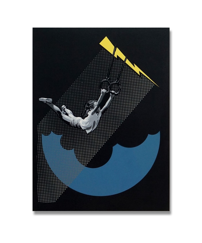 Acrylic and spray paint on cradled panel, Satin varnish