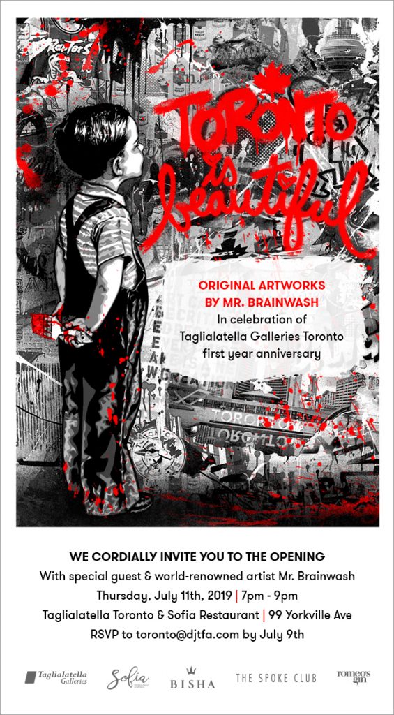 A key contributor to INK Entertainment’s recently announced Yorkville Murals festival and to celebrate the gallery’s one-year anniversary, Mr. Brainwash will create a 70 by 7 foot mural showcasing his signature spray paint style, followed by a four week exhibition called “Toronto is Beautiful” at Taglialatella Galleries. Celebrating all things Toronto, the artist will also create limited edition custom prints that pay homage to the city and his time here.