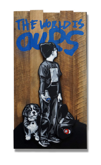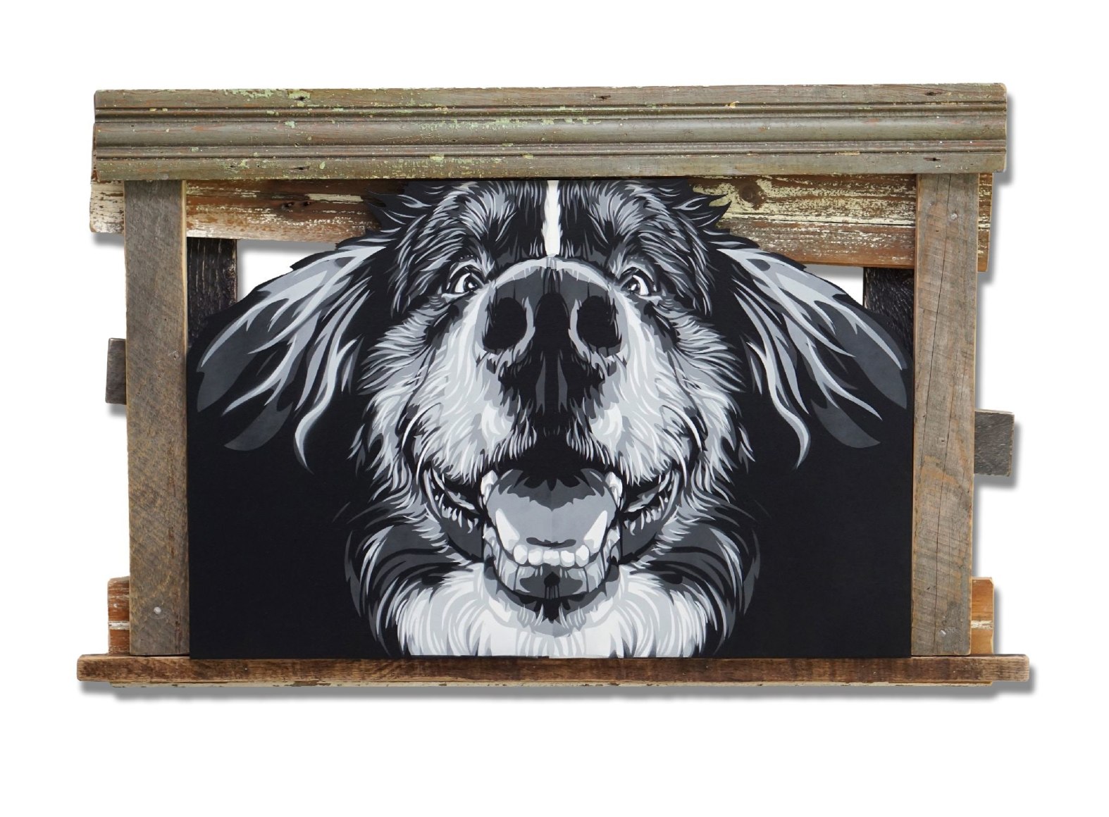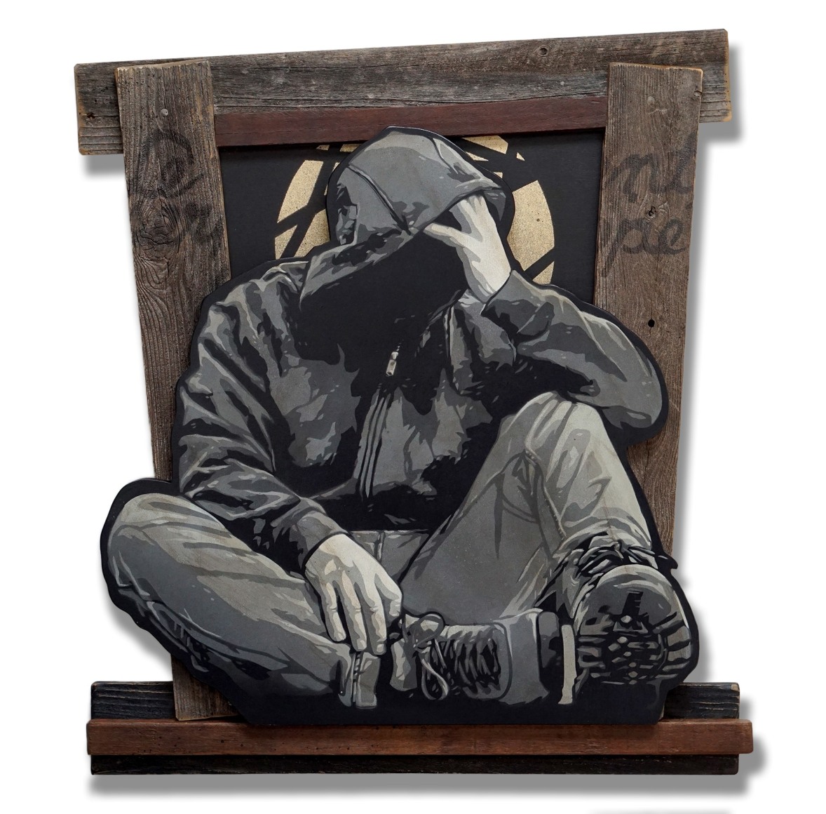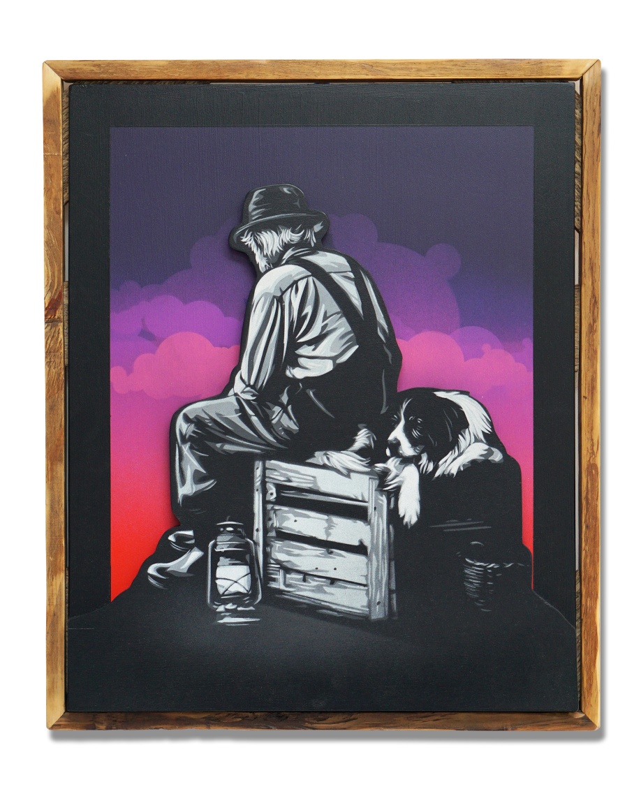 Spray paint, hand scrolled wooden cutout, wood panel and reclaimed wood assemblage, shellac and satin polycrylic finish