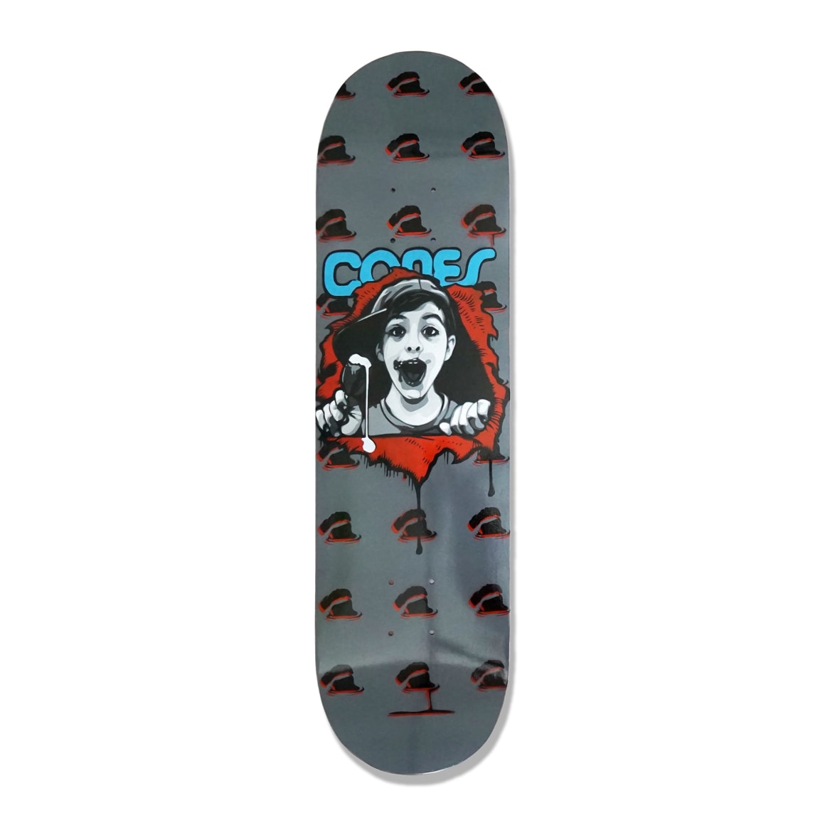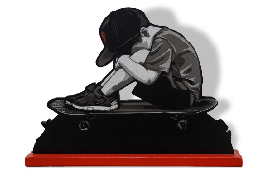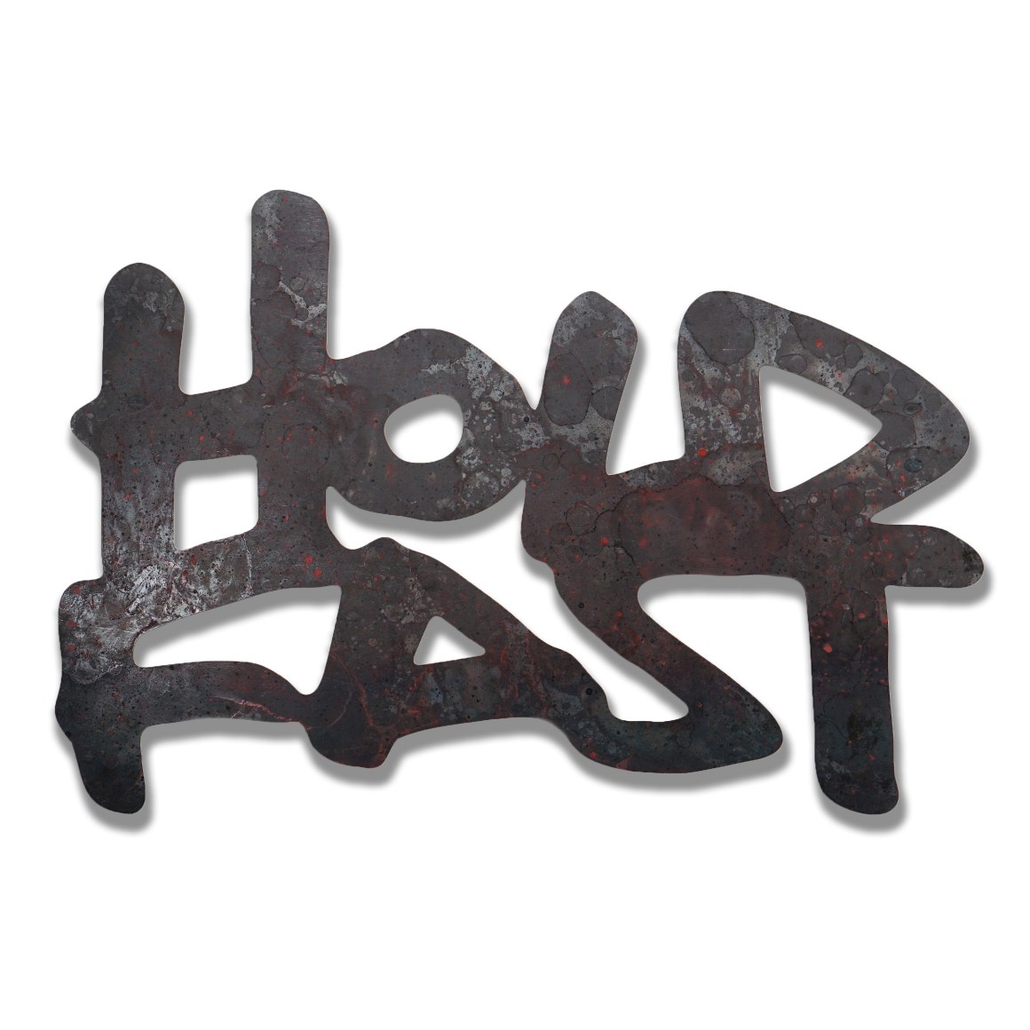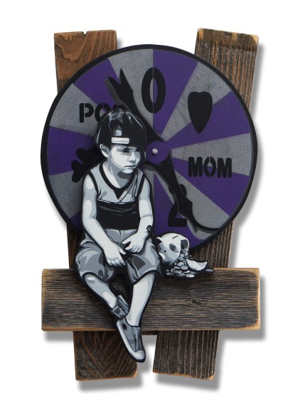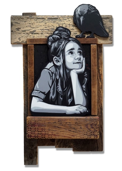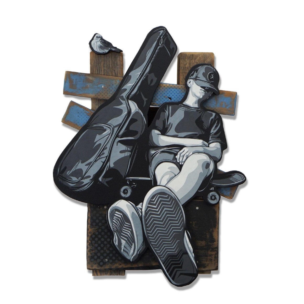 Spray paint, hand scrolled wooden cutout, wood panel and reclaimed wood assemblage, shellac and satin polycrylic finish