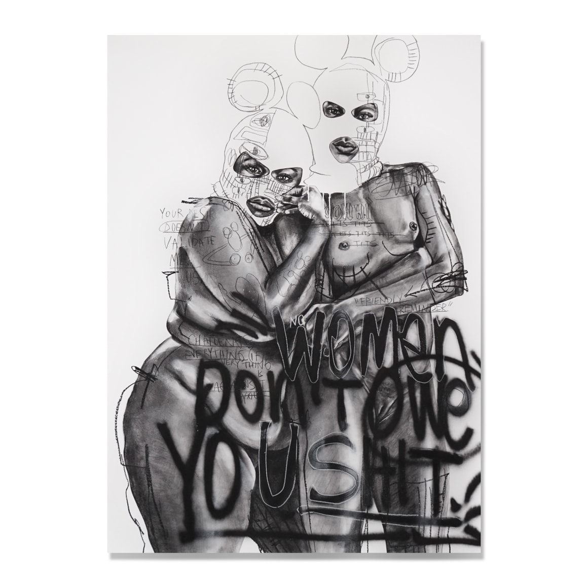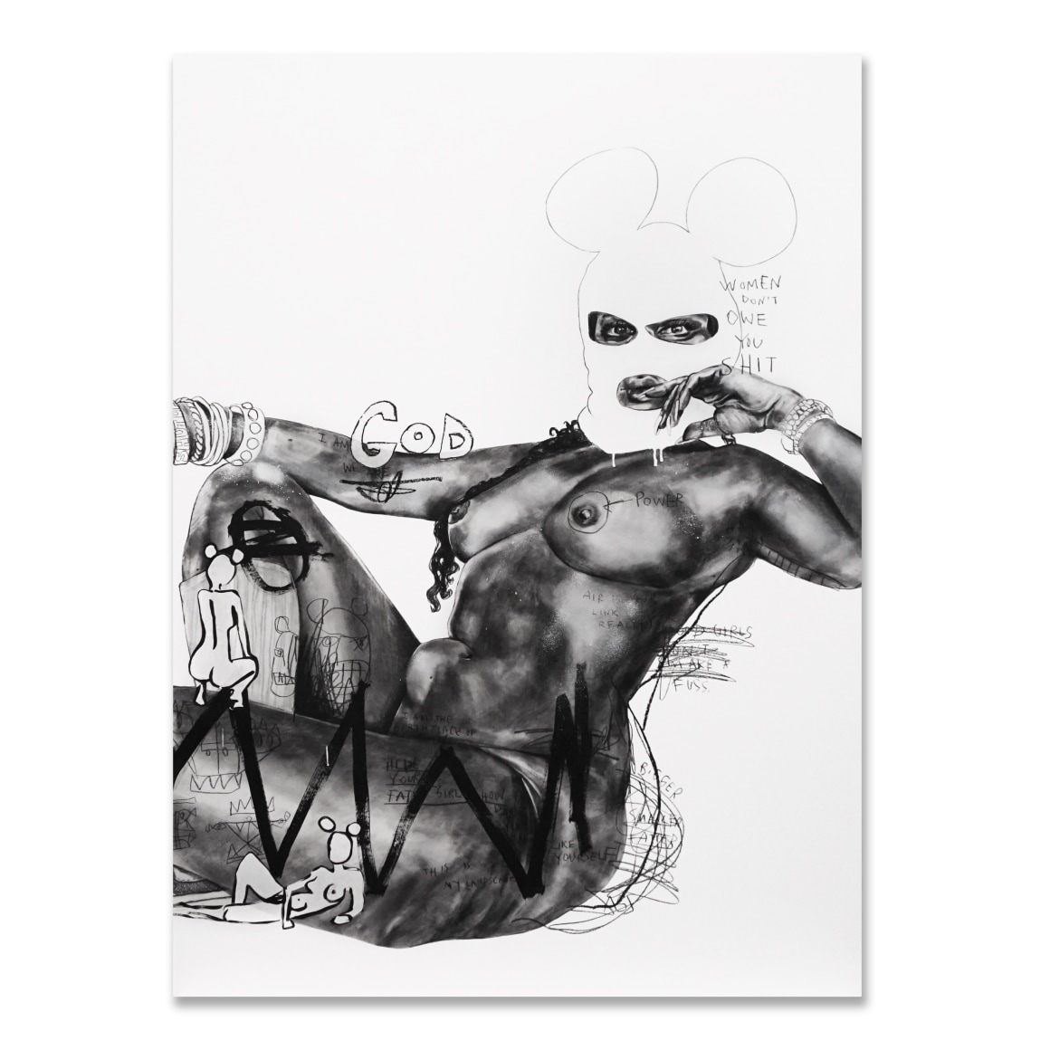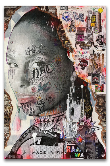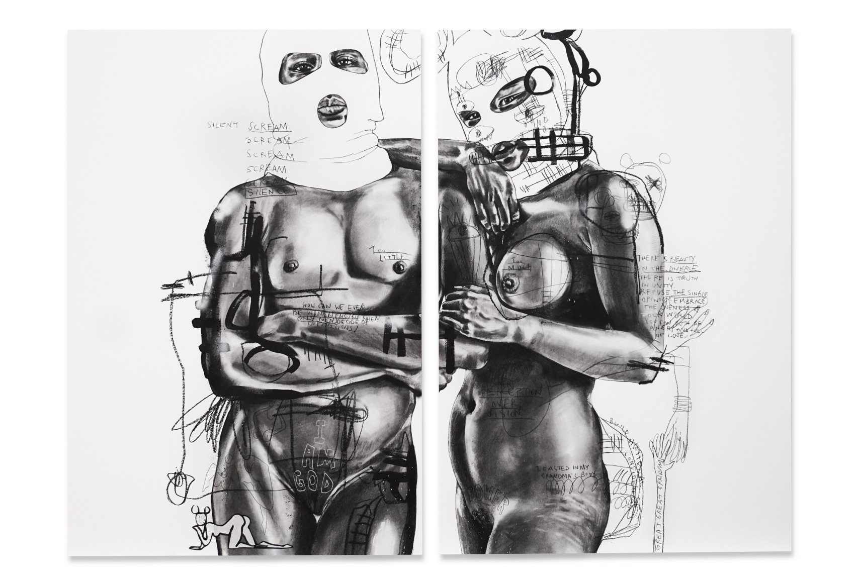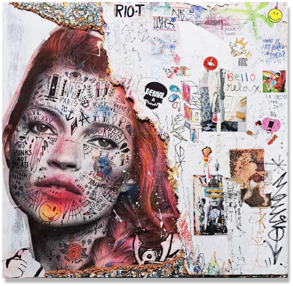 Printing, charcoal, acrylic, oil pastel, china marker, and spray paint on board