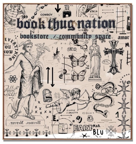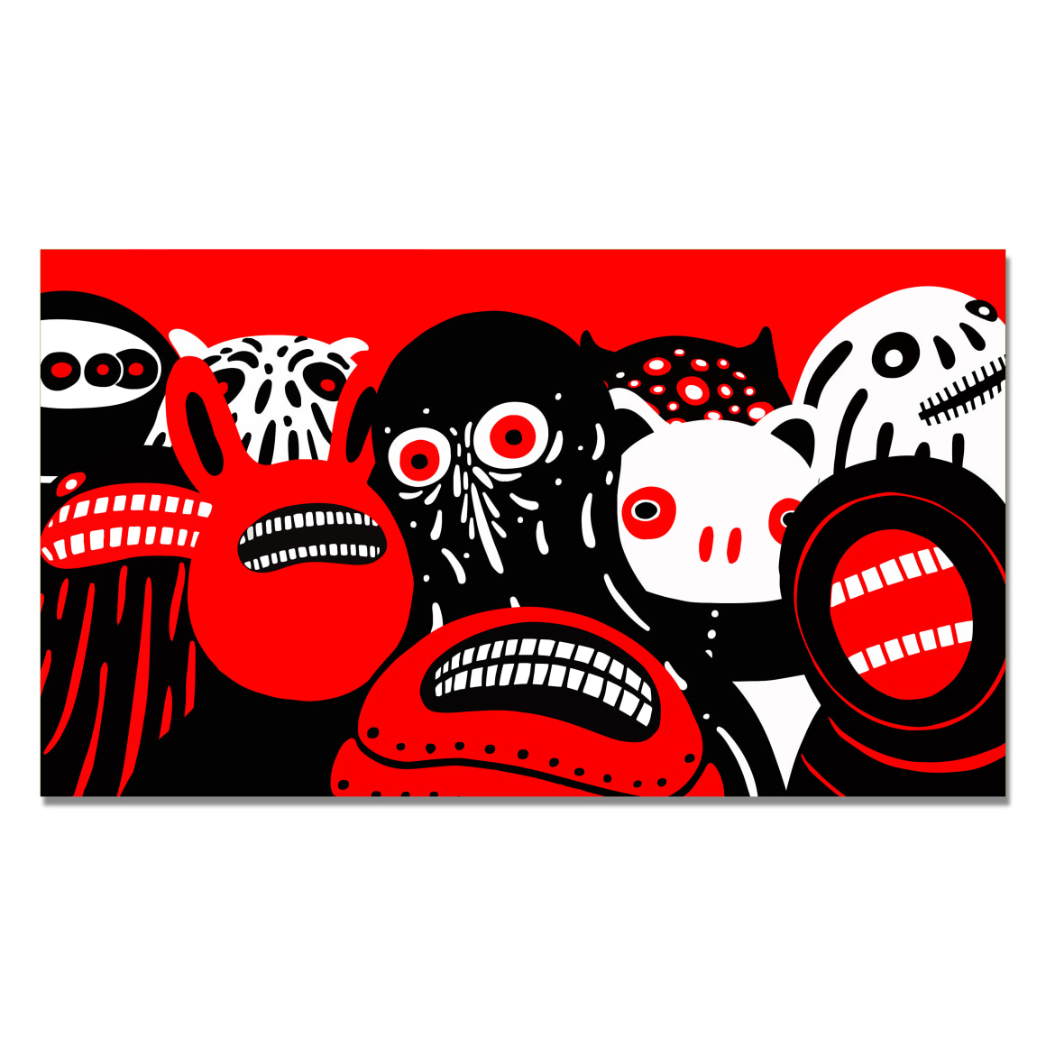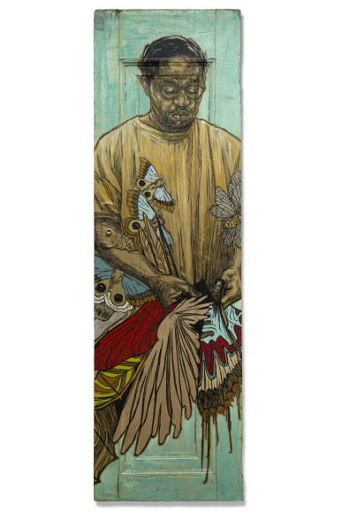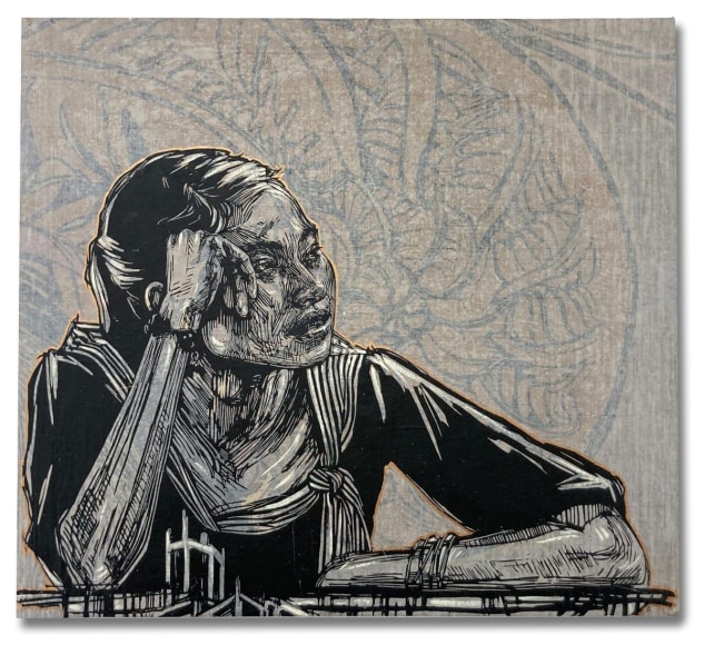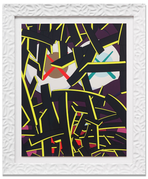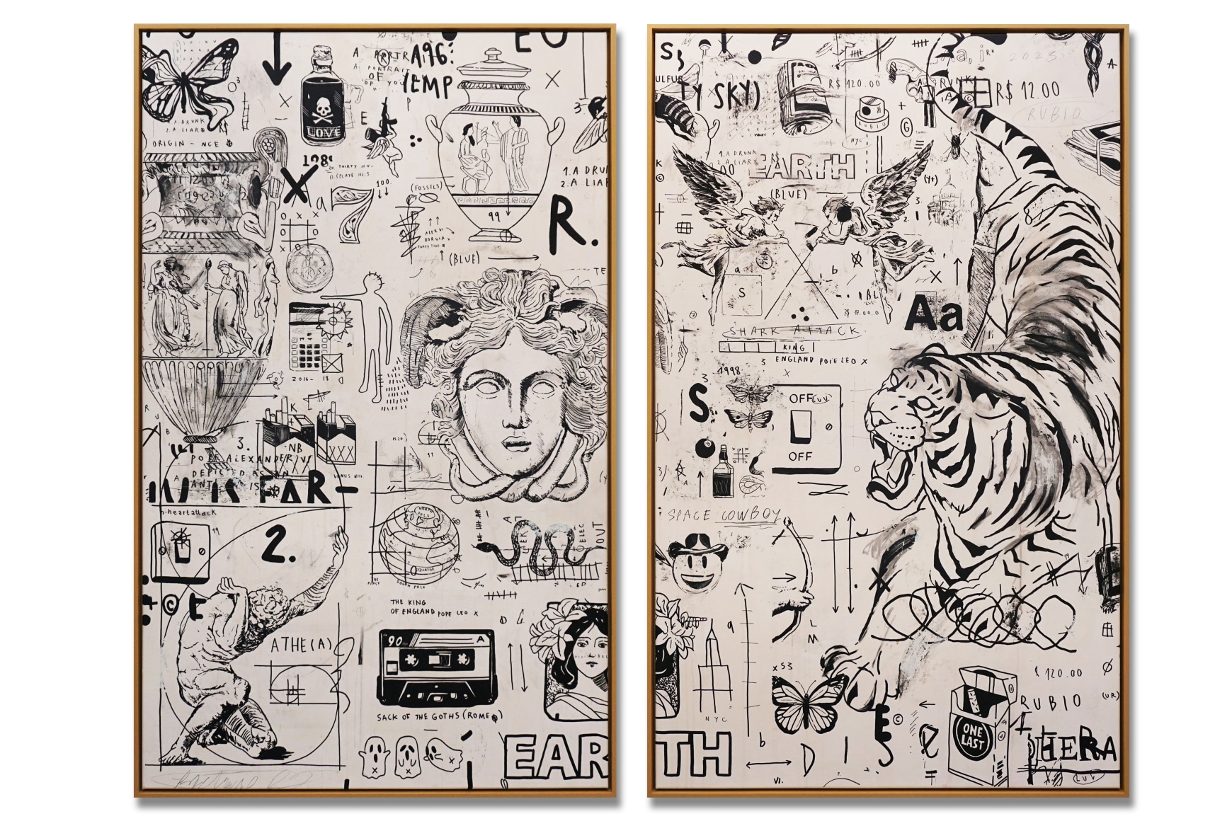 Printing, charcoal, acrylic, oil pastel, china marker, and spray paint on board